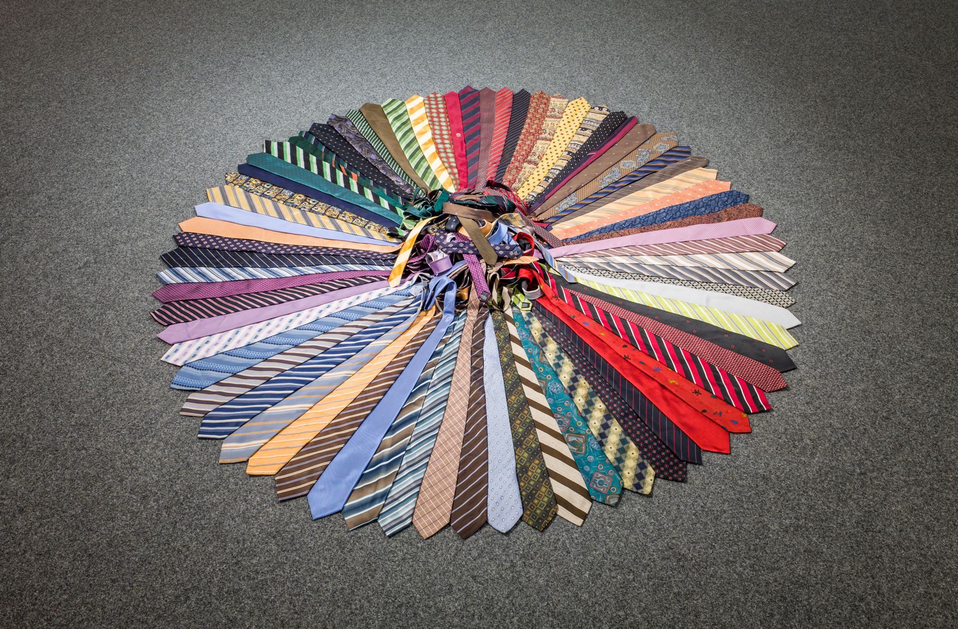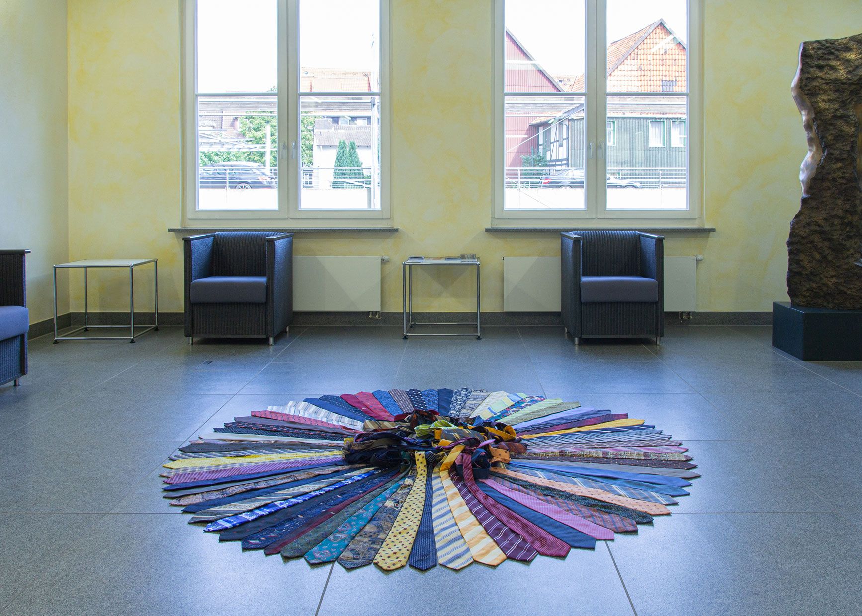 Krawatten wurden im Zuge sich verändernder Bekleidungsvorschriften für Männer von diversen Banken in ganz Deutschland als Spenden gesammelt. Diese werden als Räder auf dem Boden arrangiert, während die enden ungeordnet im Zentrum verbleiben.