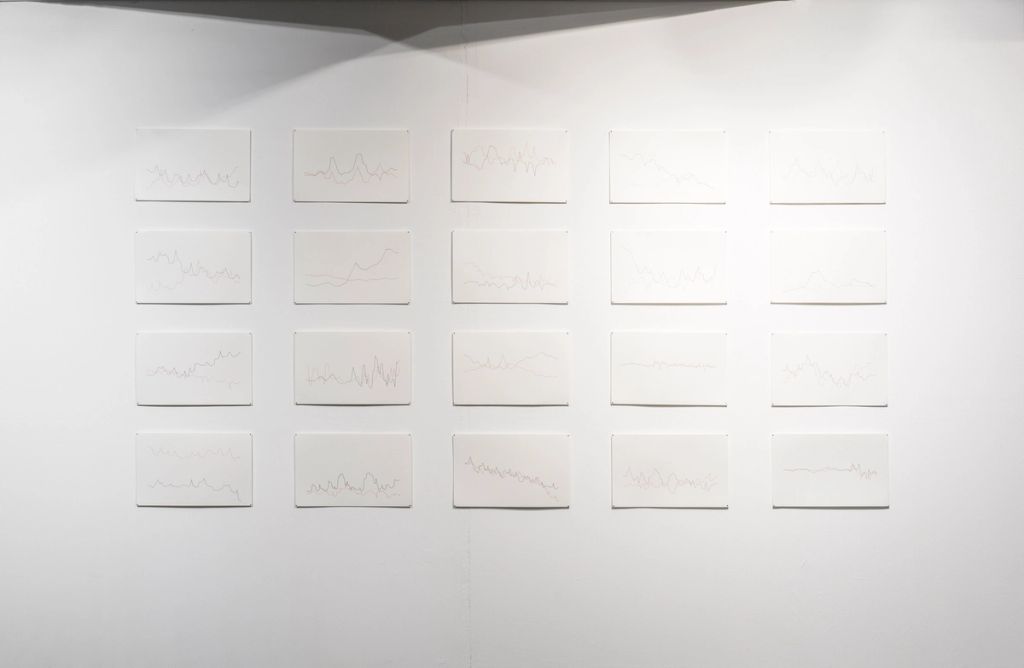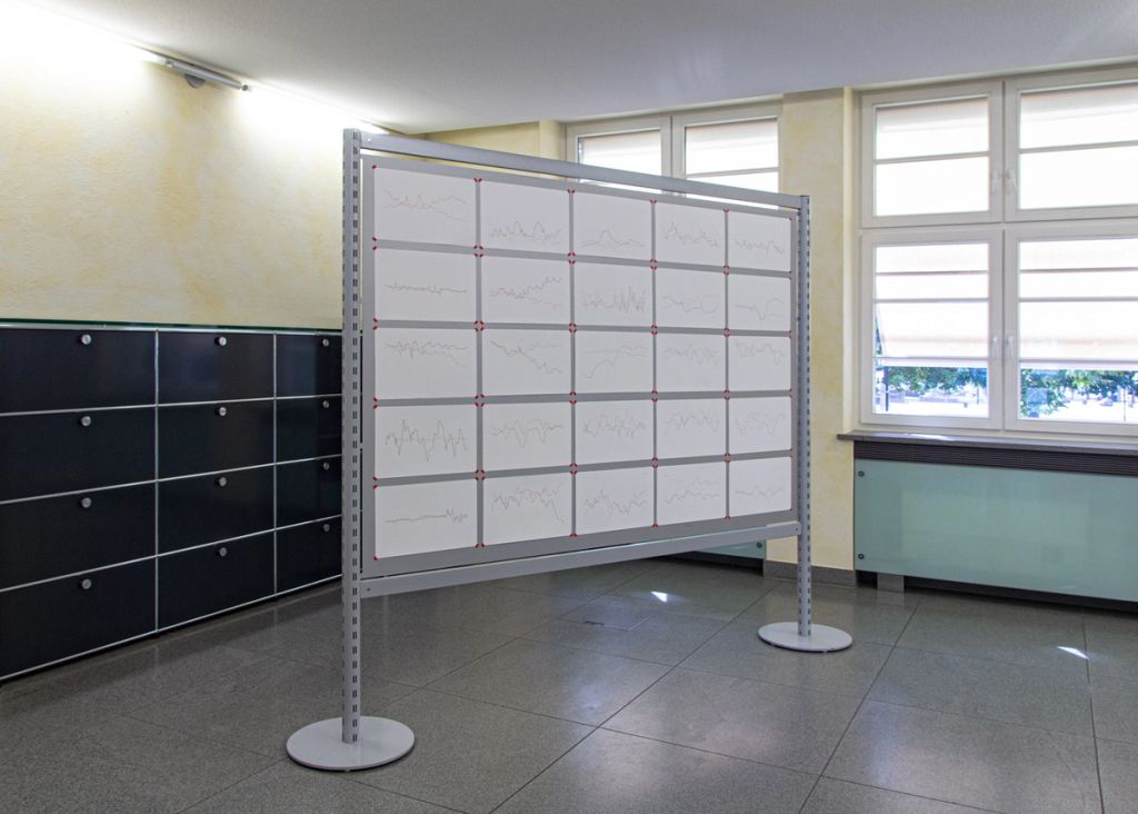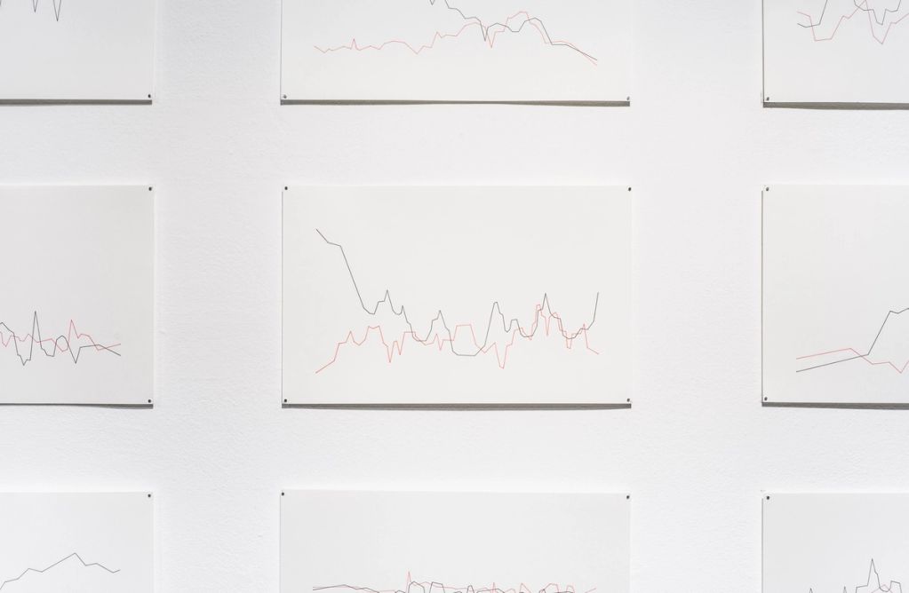 The drawings in the Graphs series show a series of static and compositional lines. There does not seem to be a reliable pattern in the individual drawings; they give a random impression. The work shows the viewer an interplay between concrete and mathematical approaches to art. In keeping with Philipp Valenta's other works, in which he deals with topics such as economics, money, and everyday life and combines them in his artistic works, Graphs forms a bridge to these worlds. The display of the various individual pieces in the series on a board or wall, evenly and accurately hung at equal distances from each other, is reminiscent of a presentation in an office, school, or university. One automatically compares the ink and pencil drawings with each other, as if they were statistics or, following the title of the work, graphs. In addition, Philipp Valenta completely dispenses with a legend that refers to the content of the individual drawings or even to a connection between them. The viewer literally searches for a meaning in the graphs, which, however, they artificially create through their image. Only the manner of presentation as “pure compositions of lines” allows a connection to be established between them.